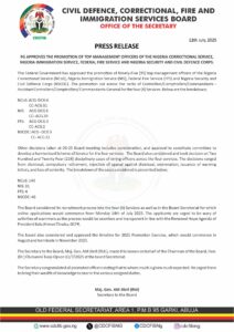 Federal Government has approved the promotion of top management officers of the Nigeria Correctional Service (NCoS), Nigeria Immigration Service (NIS), Federal Fire Service (FFS), and Nigeria Security and Civil Defence Corps (NSCDC).