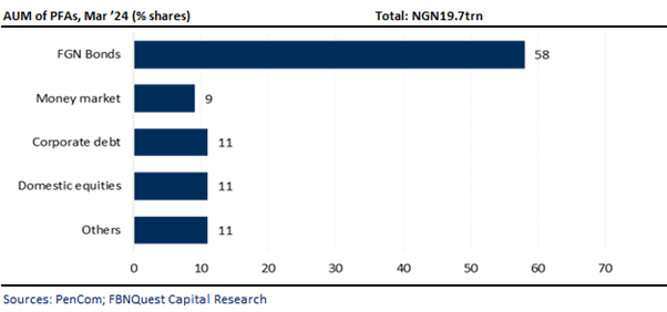 - The FGN Bonds drove the m/m reduction in pension assets, whose value decreased by -NGN284.4bn or (-2% m/m) to NGN11.5trn. As a result, its share of total AUM fell by -117bps m/m to 58.3%.