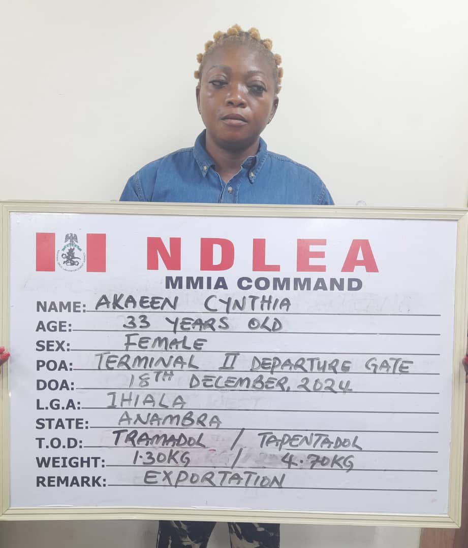 An Italy-based businesswoman Cynthia Akaeen was arrested by NDLEA officers while trying to board a Royal Air Maroc flight to Italy via Addis Ababa.
