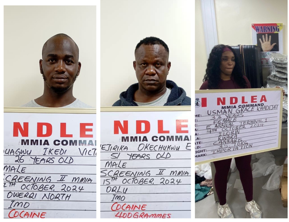 BY NKECHI NAECHE–ESEZOBOR: Operative of the National Drug Law Enforcement Agency, NDLEA said it has arrested two businessmen, Ihejirika Okechukwu Emmanuel and Iwuagwu Ikedi Victory as well as a Canada-based nurse Usman Grace Khadijat Olami, were all arrested at the Murtala Muhammed International Airport, MMIA Ikeja Lagos.