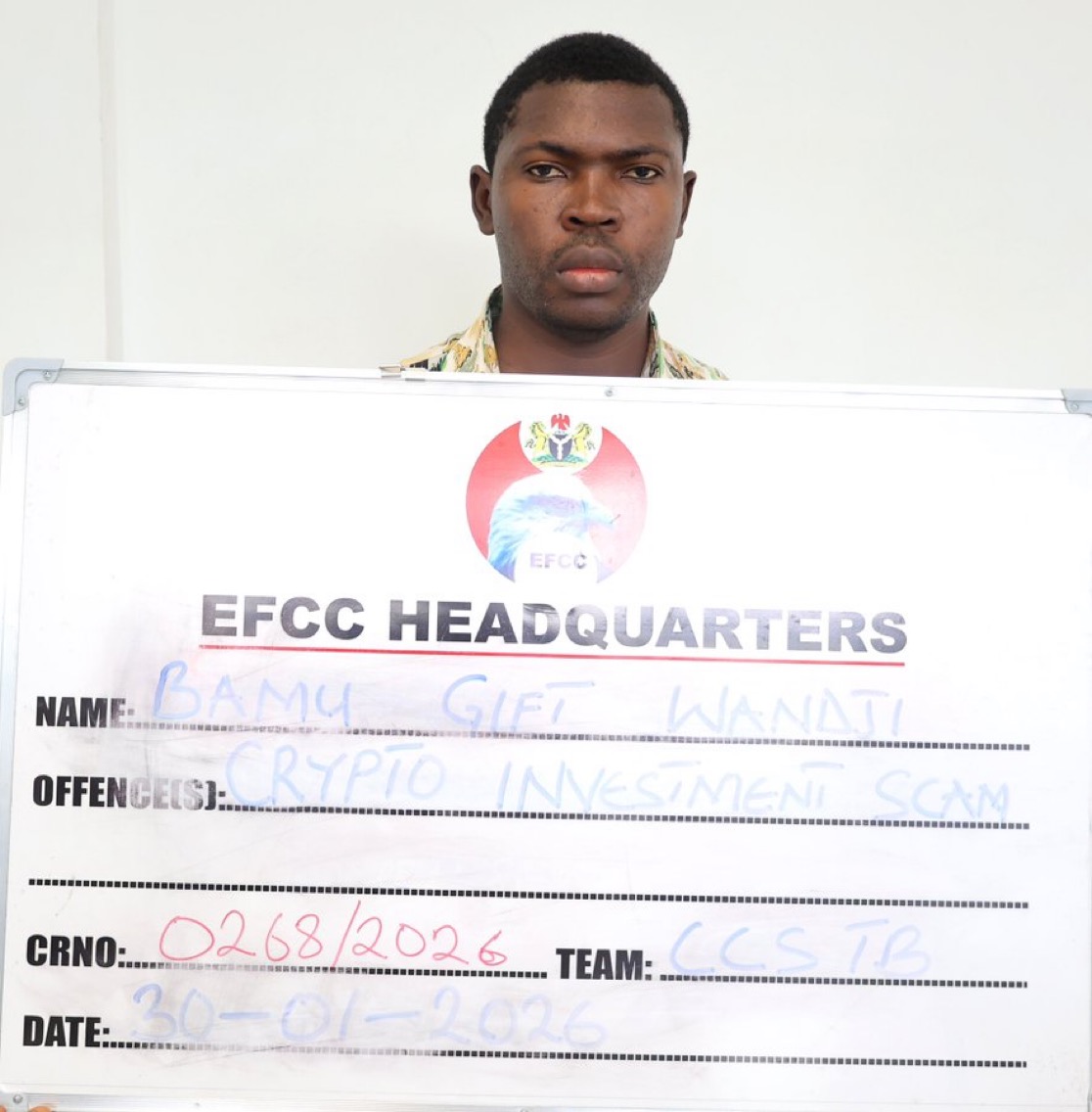 The suspect, Bamu Gift Wandji was arrested by the Nigerian Security and Civil Defence Corps, NSCDC, in Gwagwalada on January 12, 2026, for running a fraudulent investment scheme and was handed to the Commission for investigation.