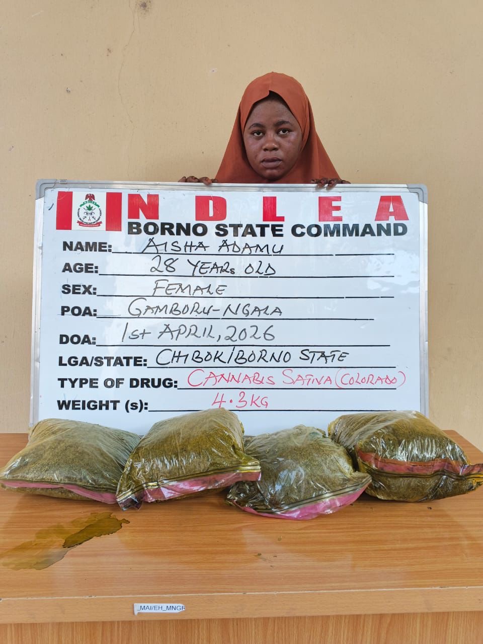 She was arrested along Gamboru Ngala road in possession of 4.3 kilograms of Colorado, a potent synthetic strain of cannabis.