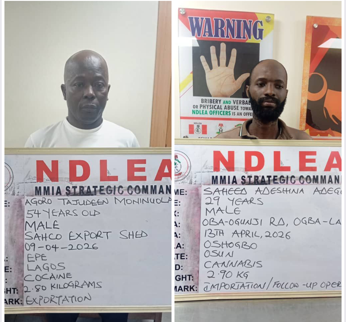 The cocaine consignment with a gross weight of 2.80 kilograms was intercepted on Thursday 9th April 2026 by NDLEA operatives attached to the export shed of the Lagos airport while two cargo agents involved in the export bid: Ama Obinna Ufeim, 33, and Ogabi Monday Akorede, 39, were swiftly arrested. Further investigation revealed a 52-year-old freight and forwarding agent Agoro Tajudeen Moninuola as the sender of the consignment and he was arrested in a follow-up operation.