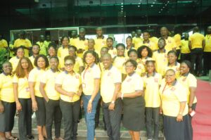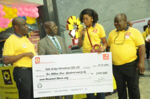 L-R: Idowu Olaitan Semowo, Executive Director (Finance & Investment), NEM Insurance Plc; Omotola Diya, an Insurance Agent receiving Cheque on behalf of a Customer from Bukunmi Adeaga-Ilori, “KieKie”, NEM brand Ambassador, and Adeyemi Mabayoje Mayadenu, Executive Director (Technical), NEM.
