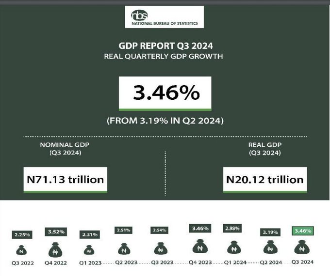 Nigeria’s Gross Domestic Product (GDP), the measure of a country’s economic health, grew by 3.46% (year-on-year) in real terms in the third quarter of 2024, the NBS reports.