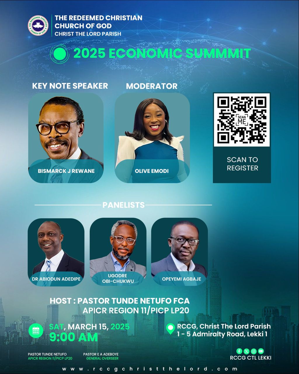 Renowned economists Bismarck Rewane, Dr Abiodun Adedipe and others are billed to attend 2025 Edition of The Redeemed Christian Church of God (RCCG), Christ the Lord Parish, Lekki Economic Summit which is scheduled to hold on Saturday 15th March in Lagos.